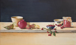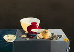 2004Glas rode wijn met antiek kommetje, rode druiven en sierfruit, etc.